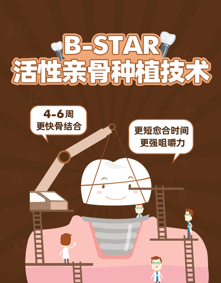 B-star活性亲骨种植技术量齿定制亲骨种植方案,通过导板精准定位种植点,术后种植体可快速附着血液与蛋白,在血液循环的作用下迅速地与牙槽骨牢固地结合,能够有效缩短骨结合的时间。